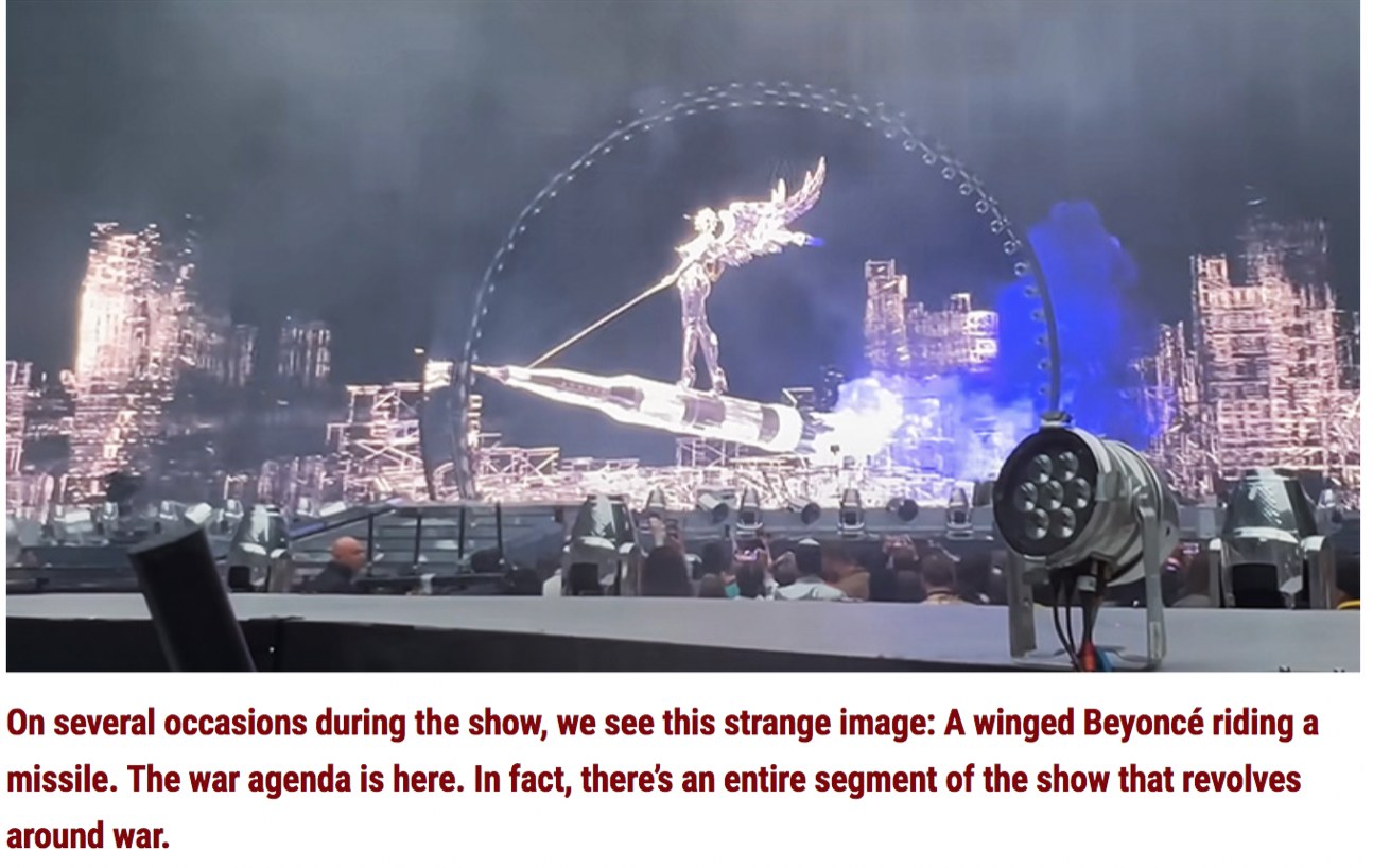 And a winged Beyonce (riding a missile) says loud and clear that our consent is irrelevant; war is coming. “Declared by media critics as the greatest pop show on Earth, the Renaissance World Tour is a massive production where no expenses were spared.”